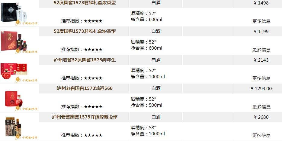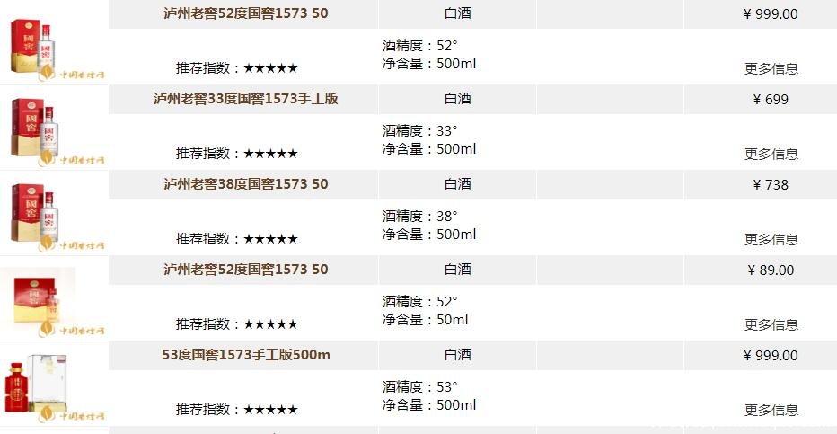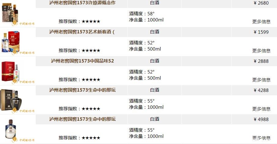 從這些圖片中可以看出,國窖1573的價格從89到17999不等,其中89這一款只有50毫升,僅僅只是品嘗試用款,其他正常酒的價格一般在幾百到幾千不等,算是比較奢侈的名貴酒了。