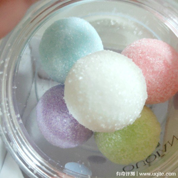 目前磨砂膏實(shí)物也挺好看的,一打開包裝就聞到了香味,仔細(xì)聞每顆味道都不太一樣,綠色是茶味,我很喜歡。它顆粒還挺結(jié)實(shí),不會輕易碎,用的時(shí)候給它先壓一壓、攆一攆,再加水用。質(zhì)地來說是細(xì)膩的,用著不疼,推開有點(diǎn)稠感,不過我可能水弄得比較多,并沒有像宣傳那樣能拉起來絲。