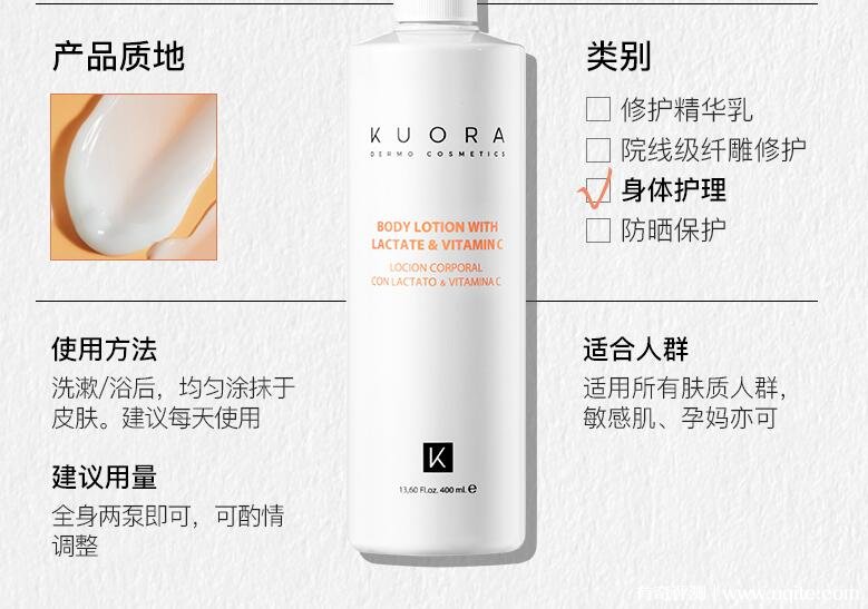 KUORA是一個來自西班牙的知名藥妝品牌,由巴倫西亞大學首席藥劑師創(chuàng)立,致力于打造天然、安全且高效的產品,幫助解決各類肌膚問題,產品均通過了嚴格皮膚測試,安全有保障。旗下產品中,亮白身體乳就是一款熱銷產品,敏感肌孕婦可用(孕婦應避免使用水楊酸和視黃醇等,此款身體乳均不含)。下面一起來具體看看KUORA身體乳有效果嗎。