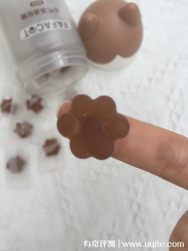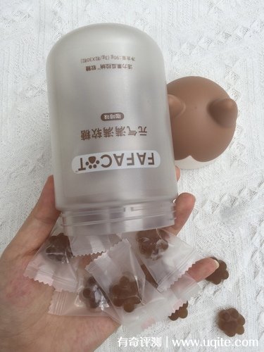 FAFACAT元?dú)廛浱墙榔饋砗苡锌诟?,而且咖啡的味道很香濃,剛開始入口的時候會有一點(diǎn)點(diǎn)微苦,但是越嚼越香,真的就挺提神的。通常我一天都是吃三顆左右,吃完以后真的會覺得精神倍兒棒,一點(diǎn)困意都沒有了。