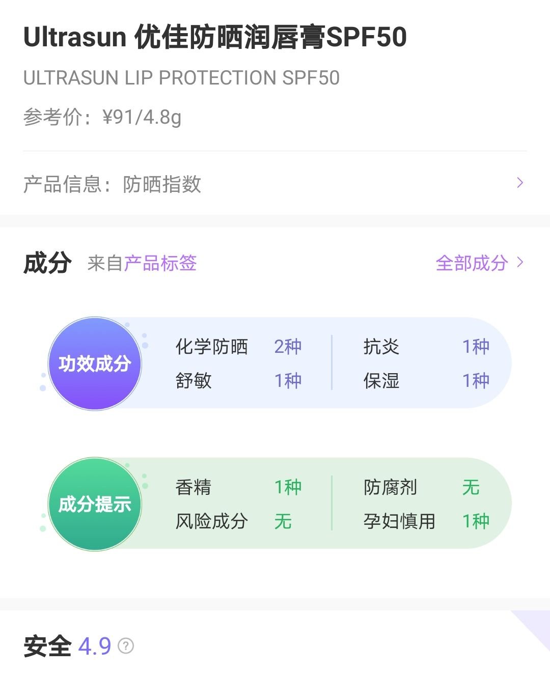 ultrasun優(yōu)佳是來自瑞士的專業(yè)防曬品牌,由ultrasun公司與瑞士皮膚癌預(yù)防中心共同研發(fā),產(chǎn)品受到了世界各地醫(yī)學(xué)權(quán)威的認(rèn)可,是皮膚科醫(yī)生推薦產(chǎn)品。憑借著高品質(zhì),產(chǎn)品也受到了消費(fèi)者的廣泛歡迎。其中,防曬潤唇膏就是一款熱門產(chǎn)品,成分溫和安全,美麗修行評(píng)分4.9(滿分5分),但屬于化學(xué)防曬成分且含有水楊酸衍生物,孕期不適用。下面一起來具體看看ultrasun優(yōu)佳防曬潤唇膏怎么樣。