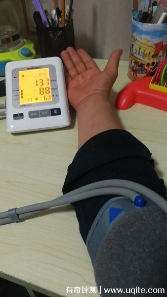 綁帶上面還有圖解,教你怎么使用綁帶,戴上后手臂壓力感不是很大,測量時間很快。結果基本正常,跟水銀血壓計進行了對比,另外還能顯示當前心跳,方便了有心臟疾病的老年人。另外脈搏波血壓計還有語音播報功能,聲音比較洪亮清晰,老人使用也不用擔心看不清楚。