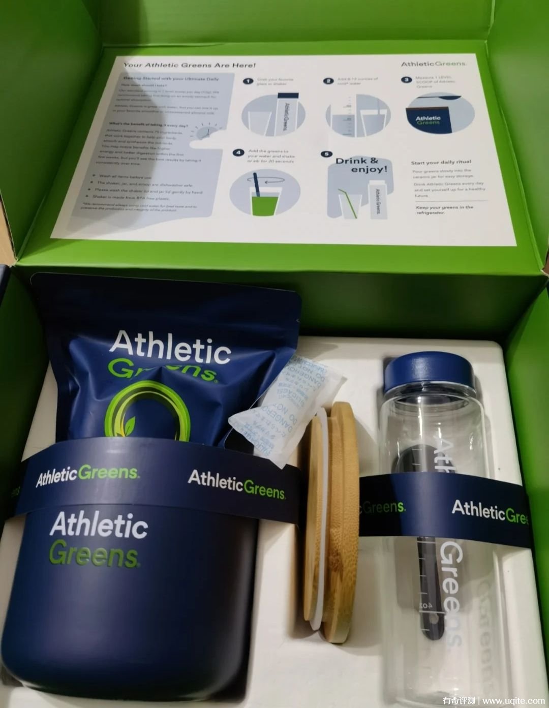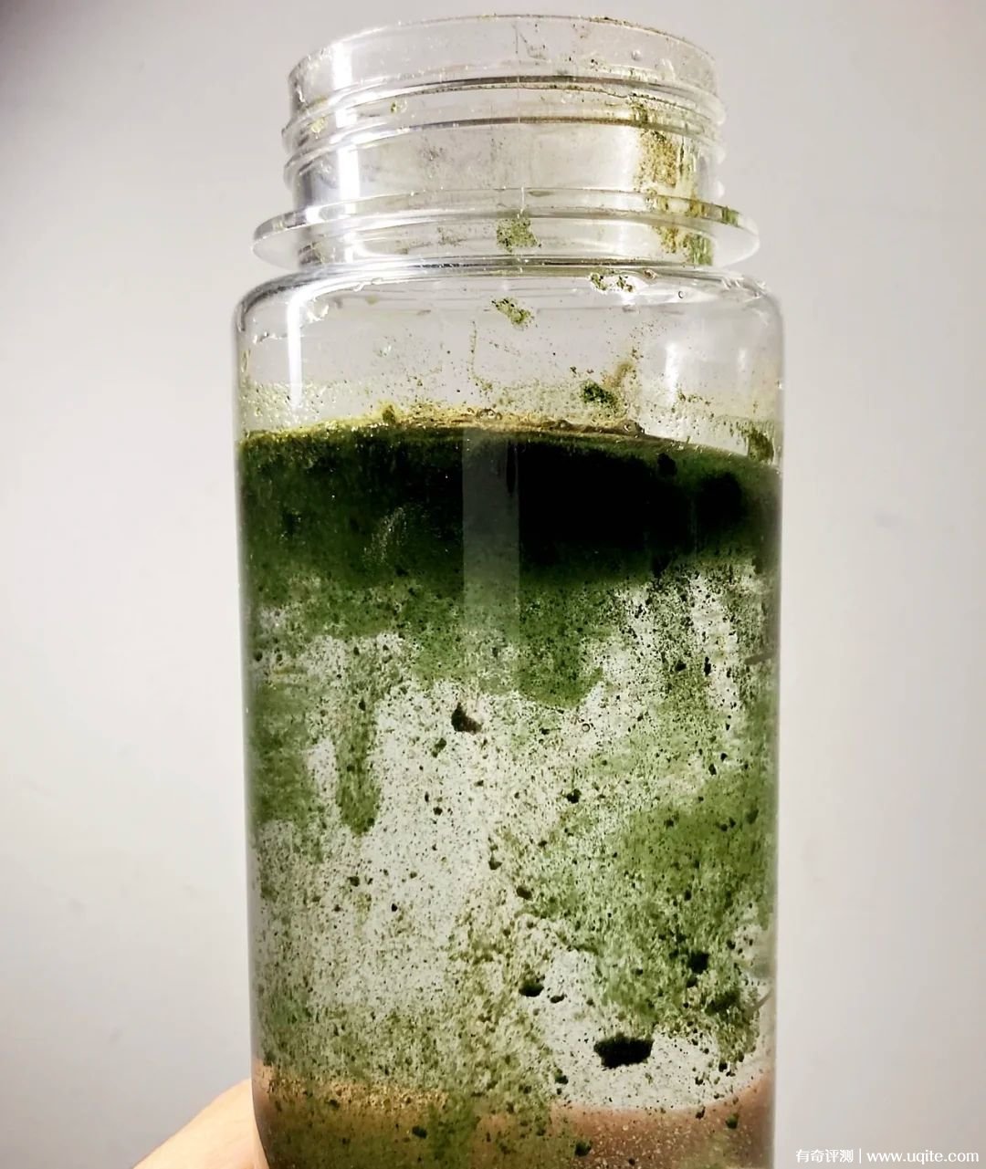 AG小綠粉配套還送了杯子,挺方便的,專門用來泡它。粉末是灰綠色的,溶解到水里面特別綠。粉末溶解挺快,但也需要搖晃搖晃,不然會掛在杯壁上。味道聞起來很清新,喝起來的話沒有想象中難喝,但也確實算不上好喝,就是蔬菜粉的味道,我要是有空,會打杯獼猴桃汁,兌進去。
