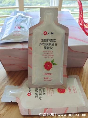 仁和膠原蛋白液的包裝還蠻不錯的,都是獨立的包裝,一次一袋,喝著很方便,出門也好攜帶,它的味道是櫻桃果味的,酸酸甜甜的,口感很好,不澀,就像是在喝果汁一樣。