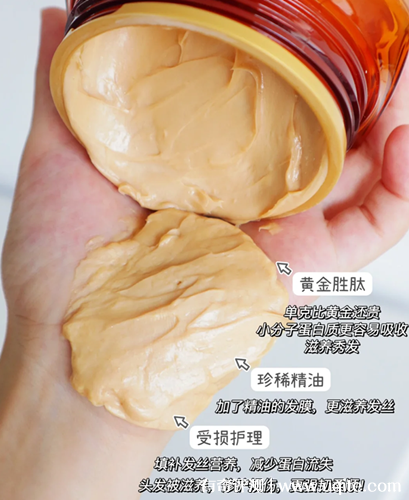 這款歐萊雅黃金發(fā)膜到手后就還挺大一罐的,而且打開(kāi)以后味道很好聞,發(fā)膜的質(zhì)地還挺細(xì)膩絲滑的,上手涂抹是鎏金色的,而且質(zhì)感很醇厚。