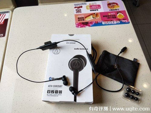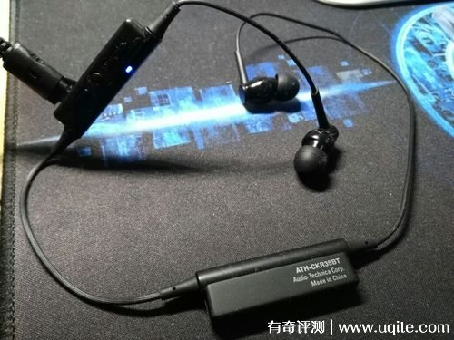 在看到鐵三角運動耳機本身,是那種經典款式,看起來比較舊的方正造型。電池和控制按鍵分開設計,這樣電池的容量會比較大,增強了續(xù)航能力。