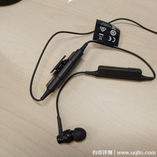 鐵三角運動耳機的線很短,但是電池和控制器令其有點偏重,不過佩戴的時候影響并不大,送了個小夾子進行輔助,問題并不大,而且運動的時候也不用擔心會掉,防水效果也挺不錯的,不用擔心汗水的影響。