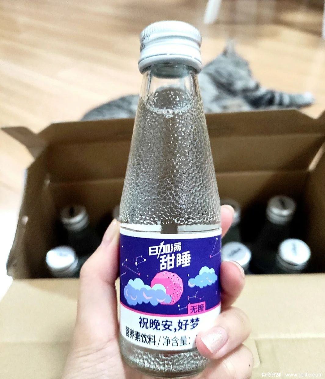 日加滿甜睡是玻璃瓶,還蠻有質(zhì)感的,喝完瓶子還能用來插個(gè)花。味道來說是有丟丟果味的感覺,不過很淡,整體是偏清爽的甜,它也介紹無糖,晚上喝也沒負(fù)罪感。