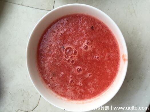 這是打好的西瓜汁,看起來很不錯(cuò),不過這是有籽的,推薦用無籽西瓜或去籽之后榨汁。