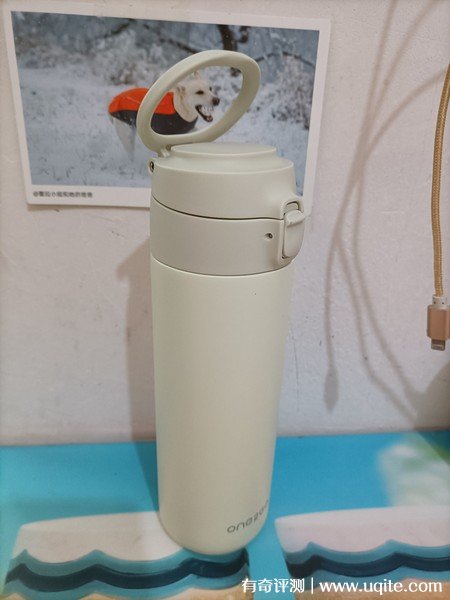 one2go保溫杯實(shí)物手感不錯(cuò),做工細(xì)節(jié)到位,沒(méi)有瑕疵。彈跳杯蓋用著很方便,飲水口是硅膠塞塞住的,很?chē)?yán)實(shí),不漏水,整個(gè)蓋子可以旋轉(zhuǎn)開(kāi),清洗方便。杯子內(nèi)壁光滑,整體聞起來(lái)沒(méi)異味,到手開(kāi)水泡了一晚上就用了。我還很喜歡它蓋子上提手設(shè)計(jì),帶去公司太方便了。