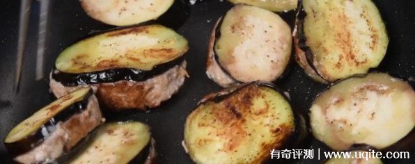 4、起鍋燒油,油溫5成熱的時候下茄子,小火煎至兩面金黃后撈出備用。