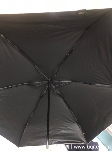 撐開之后里面是一層黑膠,說是采用的可以高效阻隔紫外線的L.R.C涂層,對紫外線的隔絕率達(dá)到了99%,這可能就是它貴的一個(gè)主要原因吧。它家還有雙層傘布的款,可能更有效,姐妹們可以試試。