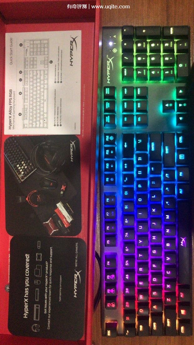 hyperx鍵盤(pán)阿洛伊RGB款白紅色調(diào)的外包裝,視覺(jué)效果還是比較清新的。