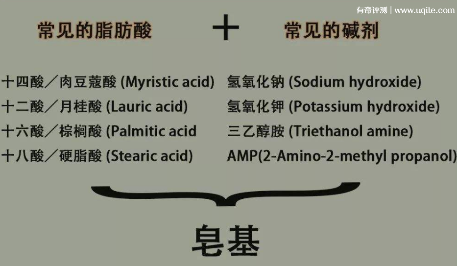 皂基故名意思就是做皂的基本原料,是一種常見的表面活性劑,清潔能力在常用的表面活性劑中是最強的,通常是由脂肪酸類物質(zhì)+氫氧化鈉構(gòu)成,即油+堿。如果洗面奶配方里出現(xiàn)月桂酸、肉豆蔻酸、棕櫚酸和氫氧化鈉、氫氧化鉀、三乙醇胺等字樣時,說明它是含皂基的。