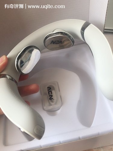 ACN頸椎按摩器拿著很輕便,內(nèi)層橡膠手感很不錯(cuò),做工方面透露出精致感,挺顯檔次的,尤其是開關(guān)機(jī)鍵那一塊。兩個(gè)電極片很貼合皮膚,兩側(cè)稍微可以掰開,用在腿上也ok。