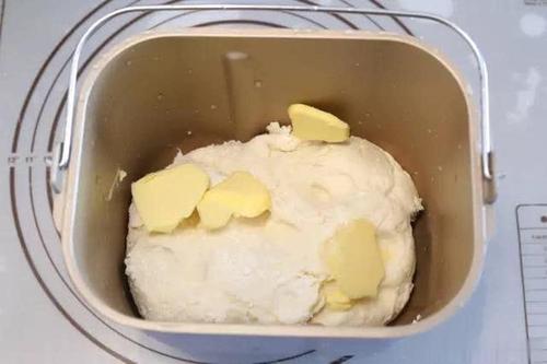 面團發(fā)酵好之后,面談比較的有有彈性,會有一種濕黏手指的感覺,這就證明面團已經(jīng)發(fā)酵的差不多了。然后放黃油啟動面包模式1。按下開始鍵進行揉面。等到黃油和面團充分糅合在一起之后,放入酵母。