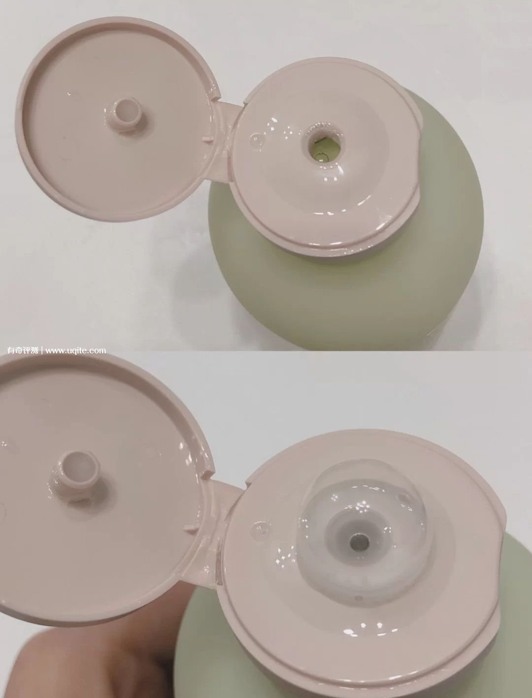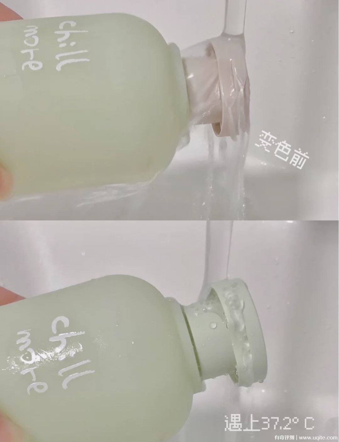 實(shí)物和宣傳圖差別不大,每次洗澡看到這個(gè)瓶子,心情都會(huì)莫名變好。它的瓶蓋有個(gè)小心機(jī)的設(shè)計(jì),就是遇到37.2℃(介紹說(shuō)是心動(dòng)的溫度)就會(huì)變成和瓶身一樣的綠色,親測(cè)是真的!