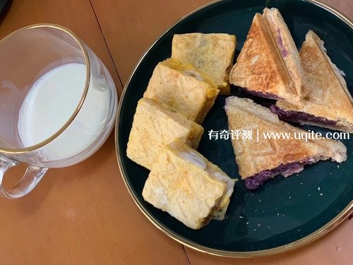 我剛開始用的時候還會擔(dān)心這款早餐機(jī)粘鍋,不好清洗,但結(jié)果大大的驚艷到我了,它完全不粘鍋,在用之前兩面都刷上一點(diǎn)油就行了,需要注意的一點(diǎn)是,在用這款早餐機(jī)做三明治的時候不要放太多的食材,可能會扣不上,我一次用的時候不知道,東西放的有點(diǎn)多,差點(diǎn)蓋子就合不攏了,它是兩面都有加熱,所以速度很塊,不要十分鐘就可以吃了,烤出來的三明治兩面金黃,口感很酥脆。