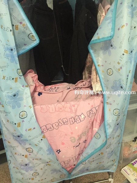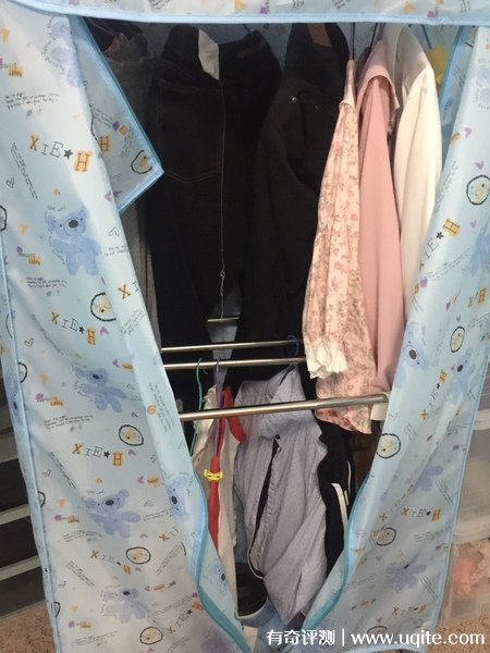 因?yàn)橐路?shí)在太多,我們可以說(shuō)把能用的空間都掛上了,一次放十多件衣服不成問(wèn)題,像有時(shí)候中間還可以放鞋子襪子。亞歷山大干衣機(jī)工作的時(shí)候是是出熱風(fēng),靠近的時(shí)候就能明顯感覺(jué)得到熱風(fēng),但是不燙,所以孩子靠近我們也不擔(dān)心。有時(shí)候衣服會(huì)遮擋住出風(fēng)口附近,也沒(méi)啥問(wèn)題,安全性這方面還是很不錯(cuò)的。