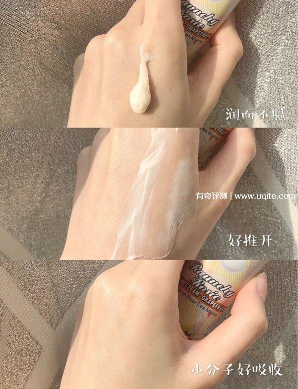 護(hù)手霜質(zhì)地比較獨(dú)特,比較像牙膏,偏硬偏稠,但是水潤度ok,好推開,也很好吸收,用完之后也不粘膩,手上摸著就像平時臉上用了水乳之后,那種細(xì)胞喝足了水的感覺,嫩嫩的,感覺皮膚更細(xì)膩了。