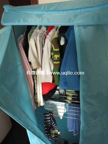 構(gòu)建很結(jié)實(shí),沒有搖晃歪斜情況。為了驗(yàn)證它的效果,我專門將晾了一夜的衣服(還挺濕的)放到衣柜里面進(jìn)行使用,主機(jī)出熱速度很快,而且風(fēng)速很大,聲音倒是很小,大大小小十件衣服烘了一個小時左右就干了,衣服也沒有因?yàn)楦邷囟冃?,效果挺不錯的。
