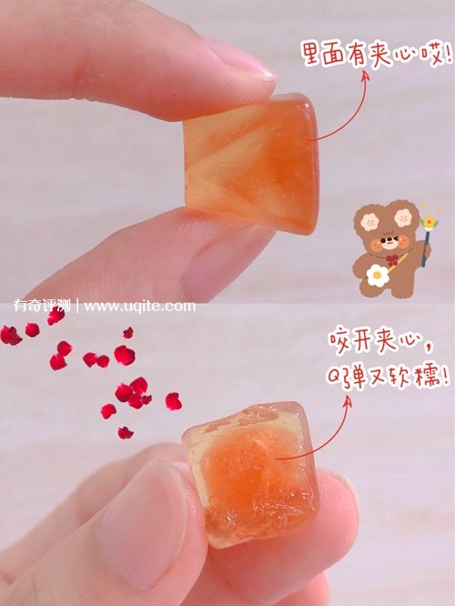 這款膠原蛋白軟糖一共有兩種味道,玫瑰味和石榴味的,因?yàn)槲易约罕容^喜歡吃石榴,就買了一款石榴味的。這款軟糖的造型有點(diǎn)像小鉆石,還挺好看的??诟泻躋彈不粘牙,中間還有夾心層,我平時也不怎么吃軟糖,但這款吃了之后簡直停不下來。