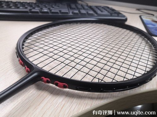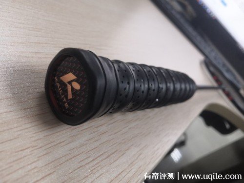 一開始看都它的拍桿很纖細,擔心容易折斷,但彎折幾次之后,感覺韌性十足,而且沒有變形,原來它使用的是四軸織物碳素中桿,相比于一般球拍的拍桿,它可以降低風阻力,同時彈力和韌性都得到了顯著的提升,讓你可以盡情的揮拍。