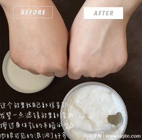 這款身體乳的保濕效果挺不錯的,我以前一到這個季節(jié),身上就會干到起皮,我一般就晚上涂一次身體乳,到第二天醒來皮膚不會干,手感依舊好,也不粗糙,看著就很有光澤度。第二天晚上雖然沒有那么光滑了,但是穿打底褲也沒見有皮屑。