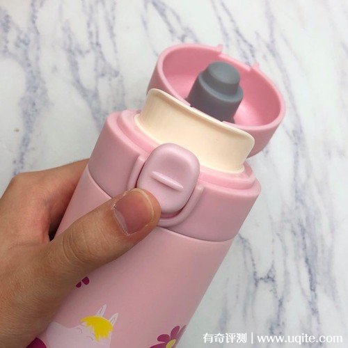只看保溫杯有粉、綠、白三種顏色,我買的是粉色的這一款,顏色和設計風格都還挺好看的,而且拿在手上的感覺也不重。保溫杯聞著沒有什么異味,感覺制作材料還是挺不錯的,但我還是稍稍給它清洗了一下。保溫杯是按鍵式的杯蓋,喝水時單手就可以操作。