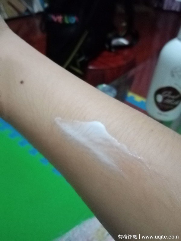 它的質(zhì)地是比較水潤的類型,偏乳液的感覺,很好推開,吸收速度還蠻快的,不粘膩,用完不到半分鐘就可以把衣服拉下來了,不會黏到衣服上。