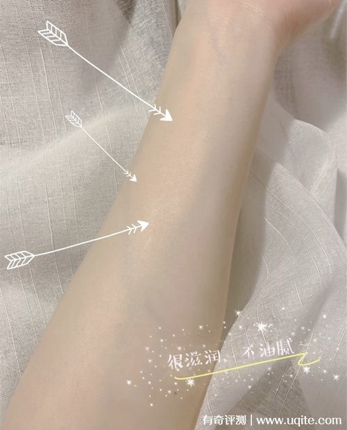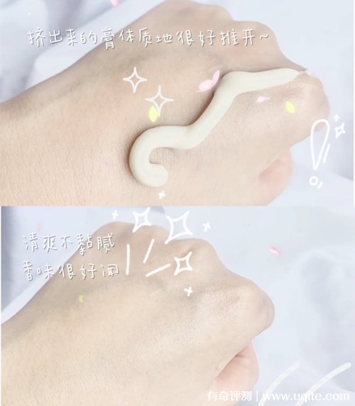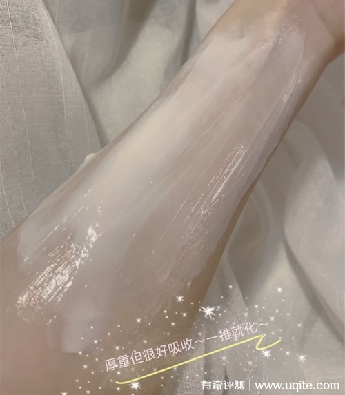 它的質(zhì)地剛擠出來是比較厚重的,挺像奶酪的,但是很好推開,吸收速度還挺快的,涂完之后沒有濕噠噠的感覺,穿衣服也不會沾衣服。