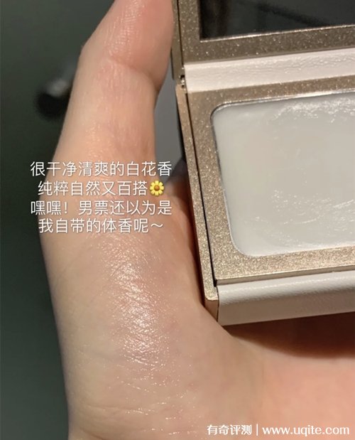 膏體的質(zhì)地是乳白色的,使用時(shí)輕輕的有手在上面進(jìn)行揉搓,然后再涂抹到手腕、頸部或者是耳后出。香膏的留香很持久,而且出門(mén)帶著身上,可以隨時(shí)進(jìn)行涂抹,比香水方便多了,關(guān)鍵是這個(gè)香膏的氣味不濃烈,只有靠近你的人才能聞到香味,男朋友靠我身上,都說(shuō)我身上香香的,而且持久度也挺好的,一天下來(lái)身上還有淡淡的香味。