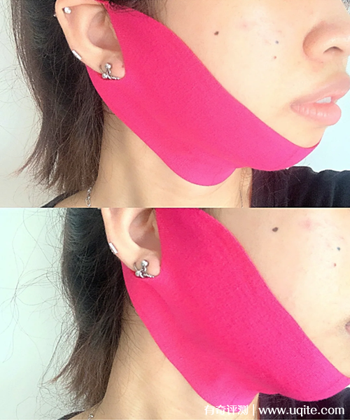 而且面膜的面積也很大吶,下半部那里可以延伸至脖子,對于頸紋也有一定的緩解,在佩戴之前要記得先將面膜充分拉長一下,然后再佩戴。如果覺得耳朵的開口小了戴在不舒服,可以沿三角的延伸線剪開一點點,是不會影響到使用效果的。