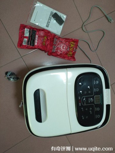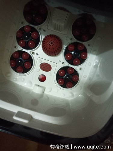 盆低有六個按摩頭,可以很好的照顧到腳上的各個穴位,中間還有一個泡藥盒的設計,除了足浴盆上的操作按鈕,還有一個遙控操作器,就算躺著也能控制足浴盆的模式。