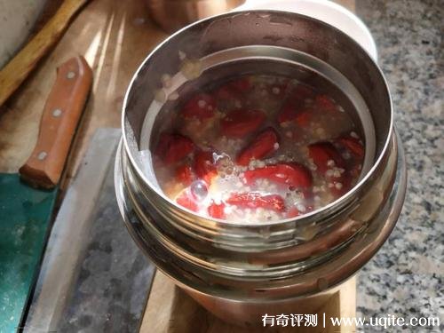瓶蓋的設(shè)計也非常的方便,外面的蓋子可以直接當(dāng)碗來使用,后來又燜了粥,不過燜粥的時間比銀耳湯要長一些,并且米還要提前浸泡,不過好在最后也燜好了,燜出來的粥又軟又糯,雖然口感比不上煮的,但是我也很滿足了。