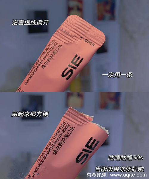 漱口水在使用時(shí)它有明顯的開(kāi)口設(shè)計(jì)線,在使用時(shí)直接撕掉就可以了,每次漱口時(shí),在口中咕嚕咕嚕30秒就差不多了,然后吐掉。使用起來(lái)超級(jí)簡(jiǎn)單,非常適合約會(huì)和重要場(chǎng)合使用。