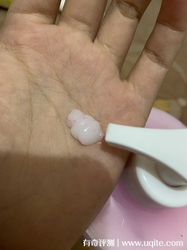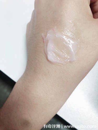 它的質(zhì)地是滋潤型,稍微有點黏,但是好推開,偶爾能爆出水珠。里面的粉色小顆粒也會自己爆掉。吸收速度還比較快,抹均勻之后大概半分鐘之內(nèi)就可以把衣服拉下來了,不會沾到衣服上,吸收之后也不油。