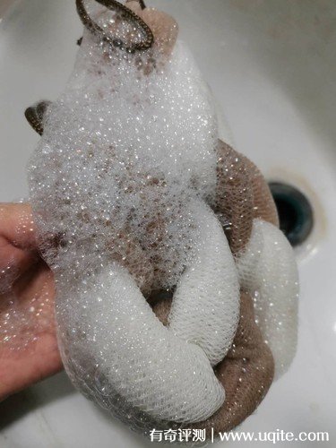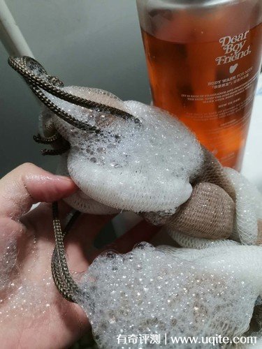 親愛男友沐浴露的流動性和起泡性還挺強的,基本上打濕稍微沾點水,就可以用沐浴球搓出很多泡沫,多搓一下,泡沫就會更綿密。它雖然泡沫多,但挺好沖洗的,基本上用水一沖就干凈了。