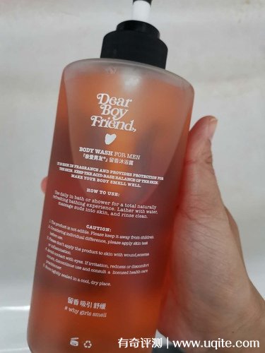 它的香味我感覺還挺好聞的,具體是什么味道我也形容不出來,感覺跟大牌的香水味很像,而且它留香的時間還挺久的,我晚上洗完,到我早上起來,身上還有它的香味,我有時候還抽煙,湊近了聞一聞,身上還有它淡淡的香味,就像是噴了香水一樣。
