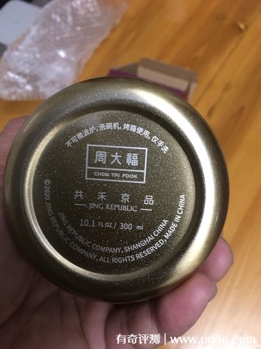 紅紅的保溫杯看著就很喜慶,杯蓋做的是一個小牛頭的設(shè)計,看著還怪可愛的。保溫杯的質(zhì)量很做工很不錯,內(nèi)壁是SUS304的材質(zhì),杯底還有周大福和共禾京品的聯(lián)名標(biāo)致,杯子的水容量是300ml,不大不小剛剛好。