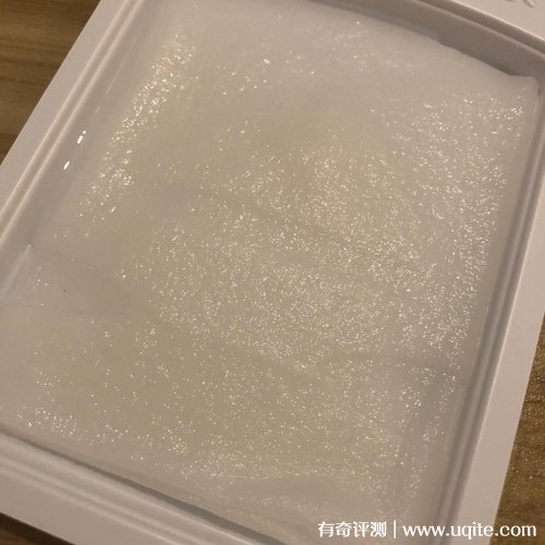 這款面膜的特殊之處就在于,它在使用前是干的,需要自己用純凈水或者是爽膚水浸泡。我每次使用,都會在洗澡前先把它泡上,然后洗完澡出來就可以直接敷了,面膜的面膜紙很輕薄,上臉很服帖。
