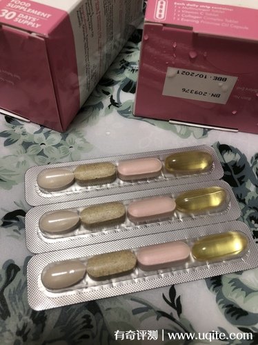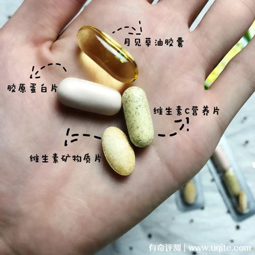 黃色的膠囊是月見草油膠囊,有促進(jìn)血液循環(huán),調(diào)節(jié)內(nèi)分泌的效果;粉色的藥粒是膠原蛋白片;大一點的黃色藥片是維生素C營養(yǎng)片;小一點的黃色藥片是維生素礦物質(zhì)片。每天使用一條就能解決所以需要補(bǔ)充的營養(yǎng)。很方便