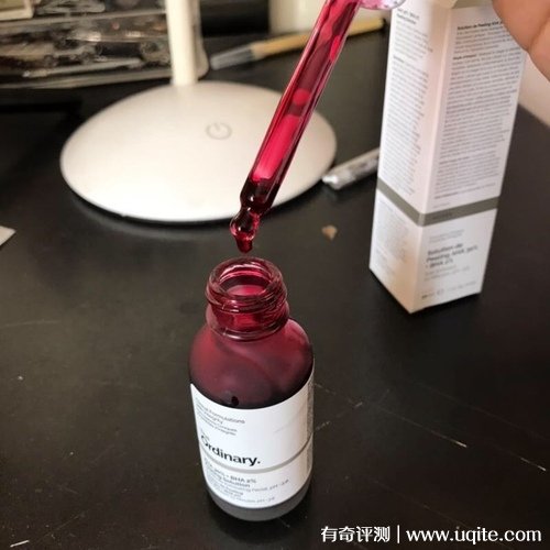 產品的包裝很簡約,形狀看著就像是一個藥瓶一樣,滴管式的提取設計,在使用時方便衛(wèi)生。這款the ordinary果酸水楊酸面膜的質地是稍粘稠的酒紅色液體,流動性不錯,很好抹開,味道酸酸的,有點像醋的味道。