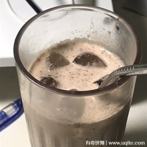 蛋白粉是巧克力色的,質(zhì)地和奶粉很像,聞起來很香。店家還有贈(zèng)送一個(gè)杯子,平時(shí)去健身房可以沖一杯帶著。蛋白粉的口感很不錯(cuò),感覺和奶茶有點(diǎn)像。有時(shí)候鍛煉完很熱,我還會(huì)往里面加一些冰塊,口感會(huì)更好。