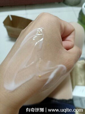 它的質地是比較滋潤的類型,剛上手稍微有一點黏,但是很好抹開,里面的顆粒會隨著涂抹過程化開,吸收速度也還挺快的,半分鐘都不用就ok。用完后皮膚很有水分感,干燥感瞬間消失,摸著軟嫩了不少。保濕方面來說也不錯,我平時就晚上用那么一次,用完后第二天一整天雖然沒有剛涂完的時候那么嫩,但是穿打底褲也不會起皮屑,摸起來還是比啥都不抹的時候細膩順滑的。