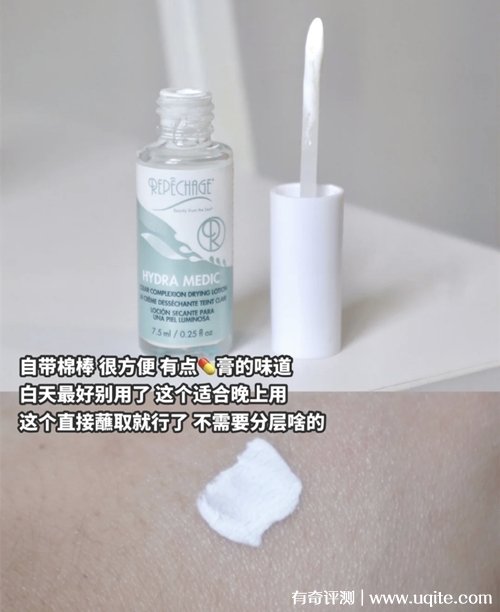這款祛痘精華的質(zhì)地是白色的粉末狀,它自帶了一個(gè)棉棒,用起來(lái)還是很方便的。Repechage祛痘精華是不需要全臉涂的,只需要把它點(diǎn)涂在長(zhǎng)痘痘的地方,上臉之后干的很快,基本上幾分鐘就全部干透了,所以涂著睡覺(jué)也可以,不用擔(dān)心會(huì)沾到枕頭上。