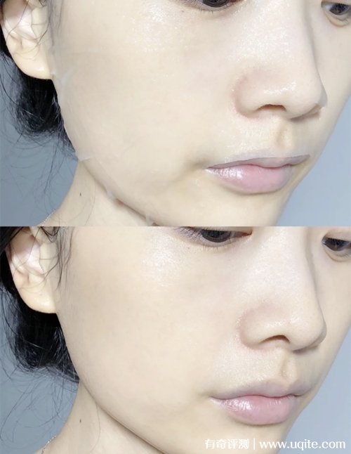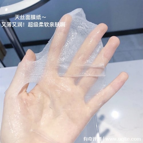 這款面膜一拿出來之后,膜布上滿滿都是精華,膜布大小裁剪的很高,貼在臉上挺服帖的,不會覺得大,也不會往下掉,它的膜布還挺薄的,貼在臉上就像隱形了一樣,膜布雖然薄,但不會一扯就變形。