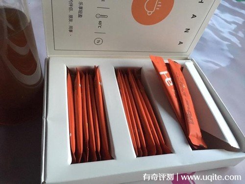 黑茶粉都是獨(dú)立的包裝,一盒里面一共有十八條,就算是出門(mén)攜帶也會(huì)很方便。黑茶粉的粉質(zhì)和紅糖的感有點(diǎn)像,使用時(shí)用溫水沖泡開(kāi)就可以了。沖泡出來(lái)的茶水是橘紅色的,喝起來(lái)的口感有點(diǎn)像陳皮的味道,也就是一股淡淡的橘子味,味道還挺不錯(cuò)的。