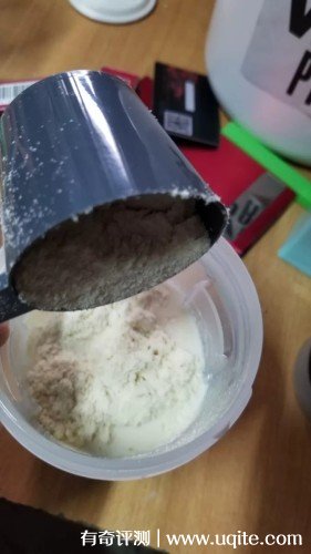 增肌粉的粉質(zhì)很細(xì),里面有配備使用的奶粉勺子,每天鍛煉完都會(huì)沖泡一杯,我一般都是舀三勺,然后再用溫水沖泡開(kāi),沒(méi)有結(jié)塊情況,在喝的時(shí)候奶香味很濃厚,口感很不錯(cuò)。