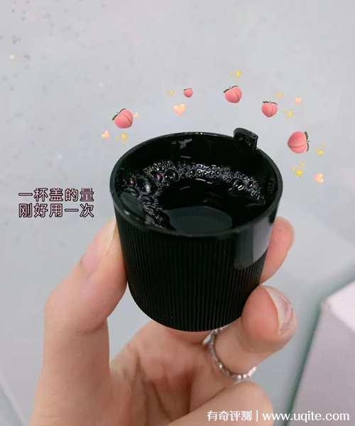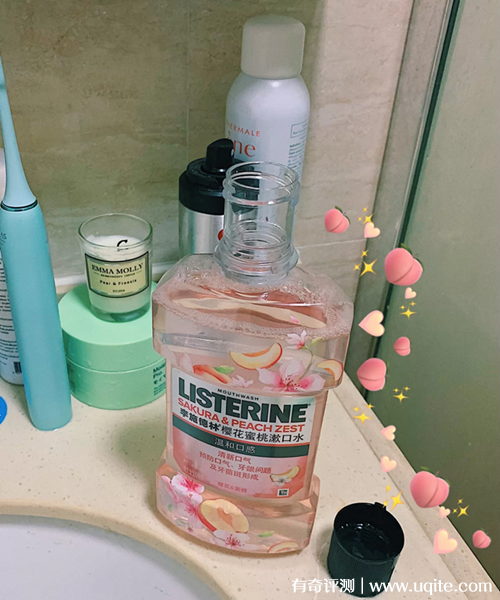漱口水是透明的淡粉紅色水狀質(zhì)地,打開(kāi)之后,就能聞到一股很香甜的櫻花味和桃子味,味道很不錯(cuò)。每次使用時(shí)可以直接將漱口水倒入瓶蓋中使用。